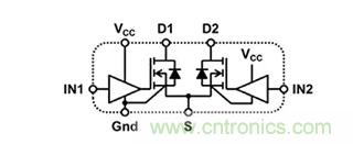 圖5:EPC 的 eGaN 集成驅動器 IC 包含兩個功率晶體管,各配有相應的優(yōu)化型柵極驅動器。(圖片來源:EPC)