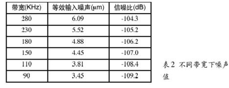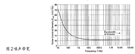 噪聲值—當運放作為有源器件時,RF噪聲值與運放噪聲是一回事。熱噪聲有一定影響,但RF電路使用的電阻通常較小,它們的噪聲可忽略不計。運放RF電路的噪聲與增益和帶寬有關。例如,使用一個運放,應用于10.7MHz中放,信號電平0dBV,增益為1,噪聲譜密度如圖2所示。此外,帶寬越窄,噪聲越低,見表2。