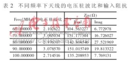 從文獻中可以查到本文所仿真的天線輸入電阻值約為150Ω,從文獻可以查到輸入電抗約為20Ω左右。實際上,不僅天線的輸入電抗與頻率有關,而且不同頻率下輸入電阻也不同,利用仿真軟件可以比較準確地得到這些參數。表2給出了幾種頻率下天線的輸入電阻與電抗值。從表2可以看出,仿真結果的輸入阻抗在工作頻帶內與理論值有一定差別,隨著頻率接近天線頻率范圍的上下限,仿真結果與理論值相差越大。通過仿真計算所得到比較準確的天線輸入阻抗,對于研究調制電路與天線的匹配問題有著非常重要的作用。