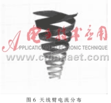 圖6表示頻率f=80MHz時電流在天線臂上的分布,可以看出傳導電流從天線饋電點(即圓錐頂部一端)流入,先經過傳輸區(約下面的2圈),再向上是輻射區(約第3圈),最后為衰減區(后面幾圈)。在傳輸區內,電流大小變化不明顯,到達輻射區后,隨著大量能量以電磁波的形式傳播,電流迅速減小,最后經過衰減區,電流逐漸減小至零,這符合天線一般規律。其中,輻射區的位置與頻率有關,即位于波長近似于圓錐截面周長的地方??梢韵胂?,不同頻率會對應不同的輻射區位置,這是CLS天線的工作特性,也是CLS天線具有寬帶特性的原因。
