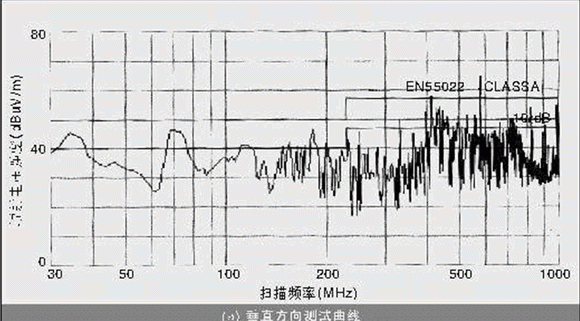 按照接入設備的電磁兼容(EMC)測試要求,設備上電正常運行,測試儀器在30~1 000 MHz的頻率范圍內進行掃描,其中在30~230 MHz頻率范圍內要求電磁干擾(EMI)的準峰值低于40 dBuV/m,在230~1000 MHz頻率范圍內,EMI的準峰值低于47 dBuV/m。測試的結果是:在垂直方向上,412.5 MHz處超標4.08 dB,577.5 MHz處超標3.5 dB;在水平方向上,577.5 MHz處超標7.9 dB,參見圖1。