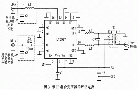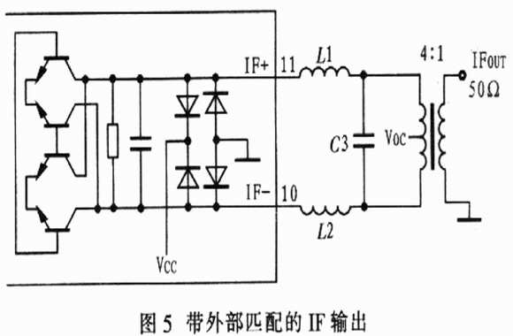 IF變壓器匹配實現最低的LO-IF泄漏和較寬的IF帶寬很簡單,如圖5所示為由3個元件構成低通濾波匹配網絡。匹配 元件C3、Ll和L2結合內部2.5 pF電容器形成1個400 Ω~200 Ω低通濾波匹配網絡,該匹配網絡諧振于所期望的lF頻率。這里4:l變壓器將200Ω差分輸出變換成50Ω的單端輸出。