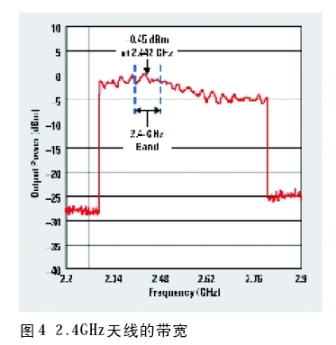 確定天線帶寬的兩種常見方法是:1)在相關頻帶上調節載波的同時對輻射功率進行測量;2)使用網絡分析儀對天線饋電點的反射進行測量。圖4顯示了第一種方法,其對一個2.4GHz 天線的輻射功率進行測量,這種天線在2.4GHz頻帶上具有接近2dB的輸出功率變化,同時還具有接近于這一頻帶中心的最大輻射。這種測量方法是通過對2.3~2.8GHz的連續波信號進行調節來完成的。這類方法應該在一個無回音室中進行,以獲得正確的絕對帶寬級別。然而,即使在沒有無回音室的情況下,這種方法也非常有用。