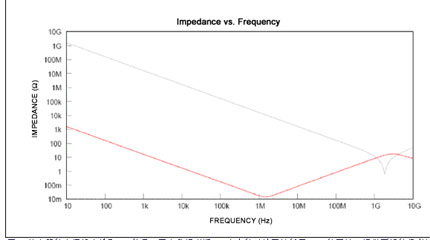 圖1.放大器的電源線會(huì)拾取RF信號(hào)。圖中數(shù)據(jù)表明1μF電容的對(duì)地阻抗低于10pF的阻抗,提供更好的噪音抑制能力