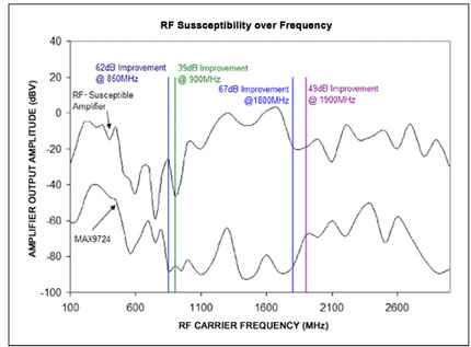 圖2.數(shù)據(jù)表明:與普通放大器相比,MAX9724有效降低了放大器的RF敏感度