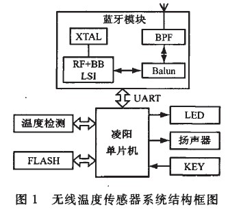 無線溫度傳感器主要由單片機控制單元、藍牙模塊、溫度檢測單元、接口電路及其它輔助電路組成,系統(tǒng)結(jié)構(gòu)如圖1所示。控制單元凌陽單片機為整個系統(tǒng)的核心,對檢測到的溫度數(shù)據(jù)進行轉(zhuǎn)換、顯示、傳輸,外擴4MBFLASH用于存儲程序和溫度數(shù)據(jù)。藍牙模塊包括藍牙芯片、放大器、非平衡變壓器(Balun)等,負責(zé)與藍牙控制終端進行無線連接和數(shù)據(jù)傳輸,按鍵完成系統(tǒng)設(shè)置、復(fù)位等信息輸人,測量的溫度數(shù)據(jù)在傳輸?shù)娇刂平K端的同時在LED上顯示,并通過揚聲器定時語音播報當(dāng)前溫度數(shù)據(jù)和超限報警。