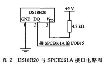 溫度檢測單元采用D1S8B02型傳感器,是美國DALLAS公司推出的一種改進型智能溫度傳感器,與傳統(tǒng)的熱敏電阻等測溫元件相比,它能直接讀出被測溫度,并且可根據(jù)實際要求通過編程實現(xiàn)9~12位的數(shù)字值讀數(shù)方式。DS18BZo與SPCEo61A單片機的接口電路如圖2所示,由于DS18B20傳感器支持“一線總線”接口,因此只需將DS18B20信號線接到單片機的1位1/0線上即可,而且在1根1/0線上可以掛接多個傳感器實現(xiàn)多點溫度測量。