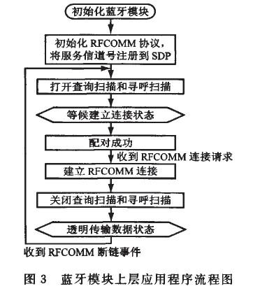 本系統(tǒng)是基于藍牙的串口應(yīng)用模型SPP(SerialPortProfile)實現(xiàn)無線數(shù)據(jù)的透明傳輸,在核心協(xié)議棧之上編寫自己的上層應(yīng)用程序。CSR的藍牙核心協(xié)議棧包括HCI、LZCAP、SDP、RFCOMM等,以固件的形式提供給開發(fā)人員,用戶編寫的應(yīng)用程序和協(xié)議棧一起運行在CSR嵌人式環(huán)境中。在CSR程序中,不同任務(wù)之間可以異步地發(fā)送消息,每一個任務(wù)在創(chuàng)建的時候可以讓其中一個擁有消息隊列,其它的就把發(fā)給任務(wù)的消息提交給該消息隊列,由任務(wù)調(diào)度程序自動運行獲得任務(wù)的消息。藍牙模塊上層應(yīng)用程序流程如圖3所示。