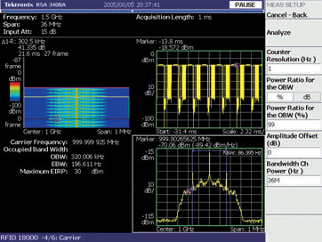 政府規定要求控制發射信號的功率、頻率、帶寬。這些規定防止有害干擾并保證每個發射者都是頻帶內其他用戶的友好鄰居。對于許多頻譜分析儀特別是通常用于脈沖信號能量測量的掃頻頻譜分析儀,進行此類測量是具有挑戰性的。RTSA 能夠分析一個完整的分組發射過程的能量特點,也能直接測量跳頻信號的載波頻率,而無需將信號置于一個跨度的中心。按一下按鍵,分析儀就能識別一個瞬時 RFID 信號的調制方式并能夠對功率、頻率和帶寬進行監管測量,使預一致性(pre-compliance)測試過程變得非常靈活和方便 [參閱圖2]。預一致性測試有助于確保產品一次通過一致性測試,而無需重新設計和重新測試。