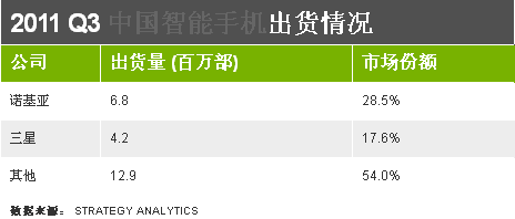 Strategy Analytics的報告顯示,今年第三季度,諾基亞仍然是中國智能手機市場的龍頭,市場份額為28%。宏達電緊隨其后,市場份額為24%。蘋果位居第三,市場份額為20.6%。