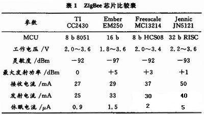 ZigBee技術(shù)是一種近距離、低功耗、低數(shù)據(jù)速率、低復雜度的雙向無線通信技術(shù),適用于無線傳感器網(wǎng)絡(luò)。目前,多家公司均有自己的主流ZigBee芯片,如表1所示。經(jīng)綜合比較,該設(shè)計選用CC2430芯片,該芯片是Chipcon公司提供的全球首款支持ZigBee協(xié)議的SoC解決方案,它在單個芯片上整合了ZigBee射頻前端、內(nèi)存和微控制器,最大27 mA的工作流耗及在休眠模式下0.9μA的流耗使之非常適合無線傳感節(jié)點對低功耗的要求。
