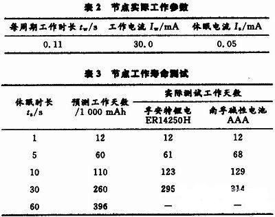 通過測試獲取節(jié)點工作參數(shù)如表2所示,工作電壓為3.3 V。可知,節(jié)點工作時流耗大,在休眠狀態(tài)則小得多。因此,為保證在供電電量有限的情況下獲得更長的工作壽命,有必要將節(jié)點設(shè)置為間歇式工作模式,即工作休眠周期性交替進行。下式為節(jié)點壽命預測公式: