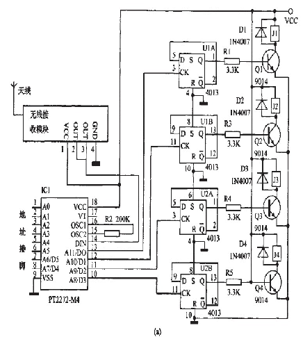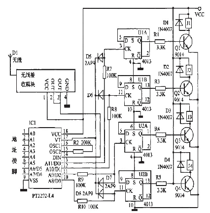 所以輸出接口在未解碼時就為低電平輸出了,即為非鏤狀態。所以如果將蠶2(a)中酶PT2272--M4改為Pr2272~L4,相應的將原理網圖2(a)改為圖3,也能實現同樣的功能,即四路非鎖狀態。如果將某一路改為蠢錟狀態,將耀應的二極管去掉幫霹。鍘如,去掉D5,就將PT2272--L4的第13腳的非自鎖定輸出改為錟定輸出。