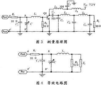 下面僅說明測量射頻功率管2SC1971的輸入阻抗的具體過程,輸出阻抗的測量方法與此相似。圖3是測量2SC1971的輸入阻抗的原理圖,圖4是他的等效電路圖。R1的值設計為10 Ω左右,以減少輸入的功率,同時HA由R1組成比較簡單,便于計算,HB由L1,C1,R2組成,同時也是功率管的匹配和偏置網(wǎng)絡。HA,HB也可以由多級L型或Ⅱ型雙口網(wǎng)絡組成,只是計算量增大。經(jīng)過實測采用單級L型網(wǎng)絡在bb′處測得的波形比較接近正弦波,測量出的結(jié)果誤差不大。