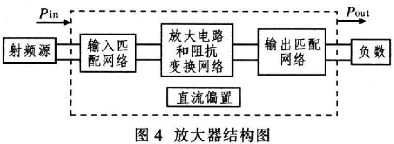 典型的放大器一般包括輸入匹配網(wǎng)絡(luò)、晶體管放大電路、阻抗變換網(wǎng)絡(luò)、直流偏置和輸出阻抗匹配網(wǎng)絡(luò),如圖4所示。確定阻抗匹配網(wǎng)絡(luò)中元件的參數(shù)、類型以及連接關(guān)系是實(shí)現(xiàn)匹配網(wǎng)絡(luò)的關(guān)鍵。阻抗匹配是射頻電路設(shè)計(jì)的重要問題,其目的是為了實(shí)現(xiàn)能量的最大功率傳輸,提高能量的傳輸效率。