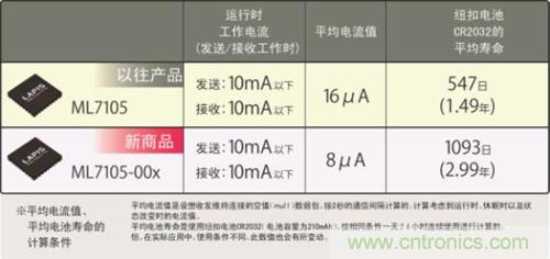 LAPIS Semiconductor去年推出的“ML7105”,實現了業界頂級的低耗電量(收發數據包時的運行狀態)。此次開發出的新品“ML7105-00x”,不僅保持了運行狀態下的低耗電量性能,而且平均電流還減少了一半。所謂平均電流,是指按一定間隔反復收發數據包時的運行狀態(耗電量大)與休眠狀態(耗電量小)的平均電流值。通過大幅減少改變狀態所需的時間,使平均電流減半,從而使電池壽命可達2倍。因此,按LAPIS Semiconductor的工況條件,支持Bluetooth® Low Energy的、使用紐扣電池(CR2032)的設備其電池壽命即使在24小時連續工作的條件下,也可充分使用2年。