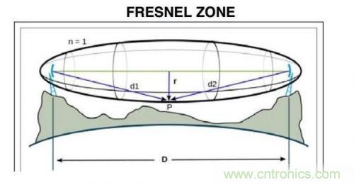 菲涅爾區是指無線電波離開天線后在可視距離周圍傳播的區域,如圖2所示。擁有視距對于保持強度有利,對于2.4GHz無線系統更是如此,原因在 于2.4GHz波易被水吸收。根據經驗,必須有60%的菲涅爾區不存在障礙物。通常,20%的菲涅爾區被阻擋時幾乎不會引起鏈路信號損耗,而這一比例超過 40%時信號損耗將非常明顯。