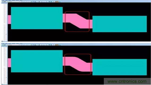 設計用于射頻和微波的銅皮形狀時,一個很重要的方面是能夠創建帶尖拐角的Gerber 文件。優秀的PCB設計工具可以簡化這一過程。例如,使用50 毫米線條繪制形狀與使用50 毫米圓形光圈繪圖相比,往往令設計具有較小的半徑。設計工具在創建Gerber 文件時,可通過正確地自動轉換線條寬度來獲得尖拐角(圖2)。