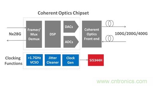 通信市場中最大增長驅動因素之一是業(yè)內城域網絡和數(shù)據(jù)中心互聯(lián)(DCI)領域從10G到100G的轉變。相干光學技術可用于100G和400G應用,因為它使得服務提供商能夠通過現(xiàn)有的光纖發(fā)送更多的數(shù)據(jù),減少為帶寬擴展而進行網絡升級的成本和復雜性。當前用于相干光的定時解決方案在成本和尺寸方面還未達到最優(yōu)化,需要VCSO、時鐘發(fā)生器和分立器件的多樣化組合。