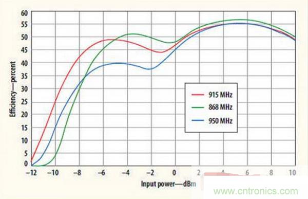 圖1顯示了Powercast P2110 Powerharvester接收器在多個頻段的性能,包括中心頻率為915MHz的工業-科學-醫療(ISM)頻段。