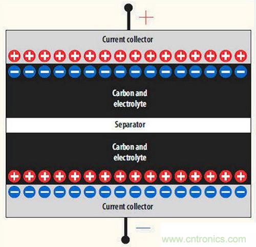 圖2是EDLC電容的橫截面圖。從圖中可以看到兩個由電解液包圍著的納米顆粒活性碳層,電解液中間則有一個“隔離”層。這兩個碳層與集電極相接觸,并由集電極將電流輸送到外部。這兩個碳層由兩個串聯電容組成,因此命名為雙層電容或DLC。由于電容內的電荷載體實際上處于離子態,因此使用了術語電化學DLC(或EDLC)。這張圖也顯示了簡單的原理,其中電荷主要集中在集電極-碳接口。電容(C)直接正比于有效面積(A),并反比于這些電荷(或C a A/d)之間的隔離距離(d)。雙層電容的正負電荷之間的間距在納米范圍,這正是EDLC電容容量如此大的原因(因為這個間距要比靜電電容的電荷間距小好幾個數量級)。