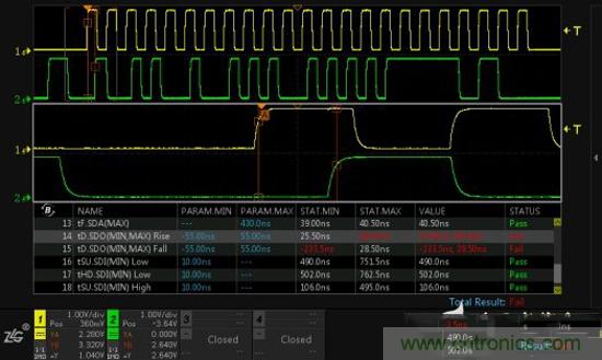 ZDS4000同時具備強大的時序分析功能,在Analyze中使能MIPI-RFFE時序分析,依靠我們具有的完整測試項目,可迅速找出時序中可能存在的問題與風險。如圖5發現的數據有效時間測試不通過,只需選中該項后輕輕一按B旋鈕,就可立即定位到測試不通過所在的位置。