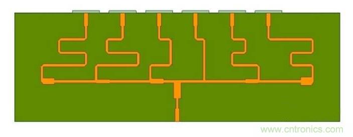 3.2節確定了各線陣激勵的幅相值,但圖8里的仿真方向圖是理想的,現實中需要通過1分6的功分網絡來將其實現。常用的功分器有Wilkinson功分器和T型節功分器;Wilkinson功分器只能組成并饋網絡,這種網絡具有較大的損耗且占用面積大,不利于小型化;而由T型節組成的串饋功分網絡具有損耗低占用面積小的優勢,更適合于實現3.2節中波束賦形的幅相激勵。