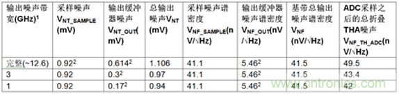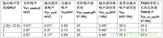 在采樣過程中,下游ADC將輸入帶寬(表1和表2中所示的濾波和ADC輸入帶寬的組合)上的所有THA噪聲外差到一個ADC奈奎斯特區間。因此,總折疊噪聲是ADC噪聲帶寬上的總THA輸出放大器時域噪聲的一部分。