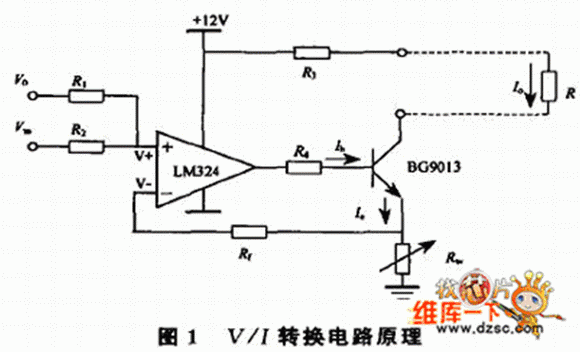 電壓/電流轉(zhuǎn)換即V/I轉(zhuǎn)換,是將輸入的電壓信號轉(zhuǎn)換成滿足一定關(guān)系的電流信號,轉(zhuǎn)換后的電流相當(dāng)一個輸出可調(diào)的恒流源,其輸出電流應(yīng)能夠保持穩(wěn)定而不會隨負載的變化而變化。V/I轉(zhuǎn)換原理如圖1。