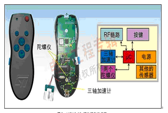 MEMS加速計與陀螺儀配合使用,可以把更先進的選擇功能變為現實,例如:能夠在空中操作的三維鼠標和遙控器。在這些設備中,傳感器檢測到用戶的手勢,將其轉換成PC屏幕上的光標移動或機頂盒和電視機的頻道和功能選擇。圖5是一個含有MEMS傳感器的遙控器解決方案,MEMS傳感器組、兩個陀螺儀和一個加速計檢測手腕或鼠標在空中的動作,同時微控制器執行動作跟蹤和手勢識別功能。然后,重組的運動曲線通過無線連接發送到機頂盒或PC機,無線鏈路可以采用紅外或射頻,具體視應用要求而定。