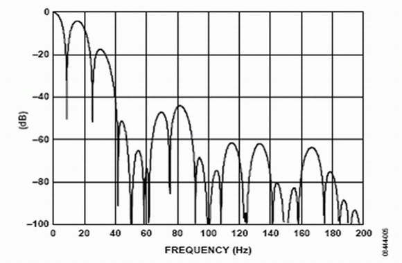 Σ-Δ模數轉換器的內置數字濾波器對于抑制帶外量化噪聲以及其他噪聲源非常有效。噪聲源之一是電力網供電系統產生的頻率。當電力網為器件供電時,將產生50 Hz及其倍頻的供電系統頻率(在歐洲),或產生60 Hz及其倍頻的供電系統頻率(在美國)。窄帶模數轉換器主要采用sinc濾波器。AD7793有4個濾波器選項,模數轉換器可以根據更新速率自動選擇需要使用的濾波器種類。在16.6 Hz的更新速率使用sinc3濾波器。如圖5所示,sinc3濾波器在頻譜內存在凹槽。當輸出字速率為16.6 Hz時,可以利用這些凹槽同時抑制50 Hz或60 Hz的頻率。
