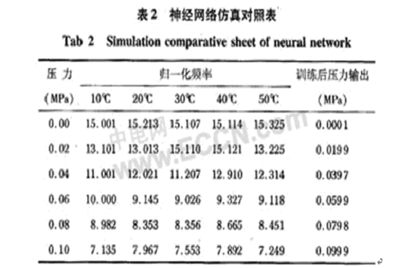 境下進行神經(jīng)網(wǎng)絡的訓練和仿真,通過神經(jīng)網(wǎng)絡工具箱,編制相應的仿真訓練程序,實現(xiàn)仿真過程。在仿真時,隨機選取幾組頻率-溫度作為輸入,最后,進行標定壓力值和仿真結果的比較。仿真數(shù)據(jù)結果如表2。