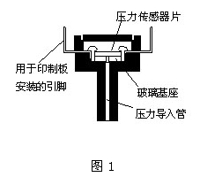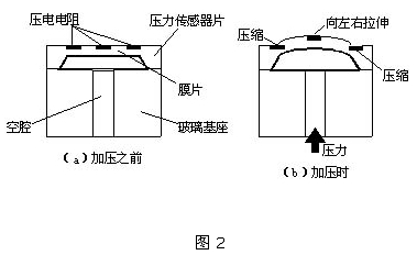 圖1為PS壓力傳感器的截面結(jié)構(gòu)圖,圖2為其傳感器部分的結(jié)構(gòu)。如圖所示,在壓力傳感器半導(dǎo)體硅片上有一層擴(kuò)散電阻體,如果對這一電阻體施加壓力,由于壓電電阻效應(yīng),其電阻值將發(fā)生變化。受到應(yīng)變的部分,即膜片由于容易感壓而變薄,為了減緩來自傳感器底座應(yīng)力的影響,將壓力傳感器片安裝在玻璃基座上。