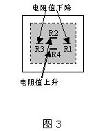如圖2(b)所示,當(dāng)向空腔部分加上一定的壓力時,膜片受到一定程度的拉伸或收縮而產(chǎn)生形變。壓電電阻的排列方法如圖3所示,受到拉伸的電阻R2和R4的阻值增加;受到壓縮的電阻R1和R3阻值減小。