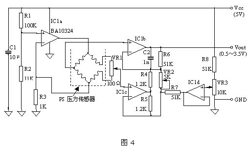 圖4是PS壓力傳感器的外圍電路設(shè)計實例,圖中用恒流源來驅(qū)動壓力傳感器。