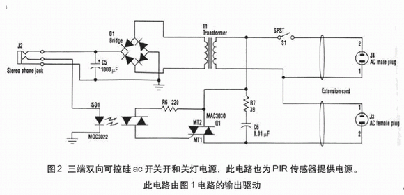 圖2示出三端雙向可控硅控制的ac開關,此電路也為PIR供電提供非穩壓12~14Vdc。通過匹配的電話插口由來自圖1電路的輸出脈沖驅動三端雙向可控硅開關。用標準立體聲音頻纜線連接兩個電路。