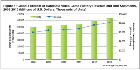 掌上型游戲控制臺的出貨量預(yù)計(jì)將從2008年的4940萬臺上升到2013年的6350萬臺,預(yù)測期間的復(fù)合年增長率為5.2% (CAGR)。估計(jì)營收將以6.4%的CAGR增長,從2008年的59億美元上升至2013年的81億美元。