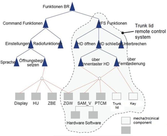 圖3是一個后備箱蓋的工作功能樹。在這里,打開后備箱實際上需要激活兩個ECU裝置。其余的ECU用來執行顯示和控制等功能。