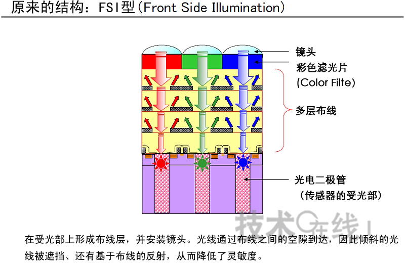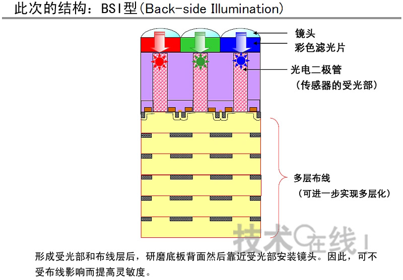 在BSI型CMOS傳感器中,可通過采用傳感器上面沒有布線層的結構來提高采光率。研磨形成傳感器的硅底板,然后將鏡頭靠近傳感器安裝。此項工序采用了晶圓薄化和接合等大量面向MEMS使用的工藝技術。由于沒有妨礙光線入射的布線層,因此可提高靈敏度。東芝表示,若是已宣布量產的1.4μm產品,則可將靈敏度提高約40%。另外,該元件的光學格式為1/2.3英寸,幀速率為60幀/秒(支持1080p以及720p)。