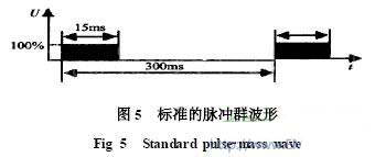 電磁兼容設計靠電磁兼容試驗來驗證與改進?,F在,有了比較完善的電磁兼容試驗方法和專門的試驗設備。開關電器動作時,形成強烈的干擾,產生瞬態脈沖。IEC61000-4-4標準對電快速瞬變脈沖干擾作出規定,分為單個脈沖、一群脈沖、脈沖群。脈沖群波形如圖5所示,周期為300ms,脈沖束寬度為15ms。