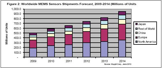 鑒于中國汽車出貨量迅速增長,在該地區已經建立據點的供應商,如Bosch和Continental,都逃過了經濟衰退的最嚴重影響。2009年中國市場占總體MEMS消費量的11%,未來幾年將繼續增長,到2014年將成為全球第三大市場,領先于日本和“世界其它地區”。iSuppli公司認為,這些動態未來五年對于MEMS傳感器供應商來說是好消息。