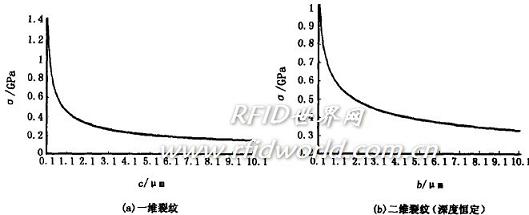 對于碎裂面垂直于芯片表面,深a、長2b的二維半橢圓型裂紋而言,則滿足Ccr=[(Φ2KIC2)/(1。2πσIC2)][2],其中Ccr=(acrbcr)1/2,acr為臨界裂紋深度,bcr為臨界裂紋半長;裂紋幾何因子Φ=(1。2π)1/2/Y。設裂紋長為2b,深度恒定為1μm,代入斷裂韌度KIC=0。82MPa,Y=1。42得,平面應力狀態(tài)常載荷條件下碎裂的臨界強度σ=0。58/4b(GPa)可見,芯片碎裂臨界強度隨著微裂紋長度的增大而急劇降低,當裂紋大于1μm時,下降趨勢逐漸平緩,并趨于穩(wěn)定小值。