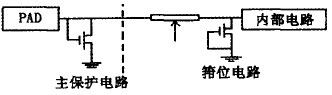 防護ESD的一種有效方法,即設計特定的保護電路。圖10即為一種基于CMOS工藝的IC卡芯片ESD保護電路7。該結構包括兩個部分:主保護電路和箝拉電路。在ESD發(fā)生時,箝拉電路首先導通,使輸入端柵上的電壓箝拉在低于柵擊穿的電壓。中間的串聯(lián)電阻起限流作用,更重要的是使PAD上的電壓能觸發(fā)主保護電路的開啟,使ESD能量通過主保護電路得到釋放。