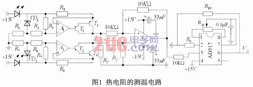 熱電阻的測溫電路如圖1所示,該電路由毫安級(jí)恒流源產(chǎn)生電路、差分運(yùn)算電路和AD517芯片組成。該電路采用兩個(gè)完全相同的毫安級(jí)恒流源分別給熱電阻RT和標(biāo)準(zhǔn)參考電阻Rf供電。在恒流源電路中,VD1和VD2為帶溫度補(bǔ)償?shù)姆€(wěn)壓二極管,四個(gè)PNP型的三極管T1、T2、T3和T4組成了兩個(gè)PNP型復(fù)合管,其目的是為了提高放大器的增益,減小誤差,以便提高恒流源的穩(wěn)定度。恒流源與RT和Rf(Rf取為Rf=100Ω)與地組成的電路產(chǎn)生的電壓作為差分運(yùn)算電路的輸入信號(hào),根據(jù)電路的組成,可以得到差分運(yùn)算電路的輸出電壓是與熱電阻的阻值成正比的,通過選擇合適的元器件參數(shù)把該裝置的測溫范圍設(shè)置為0~120℃。
