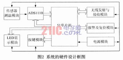 此基于EL-700鉑熱電阻傳感器的高精度測溫裝置既可以單機(jī)工作,又可以通過無線收發(fā)模塊實(shí)現(xiàn)與計(jì)算機(jī)之間的無線數(shù)據(jù)傳輸,把采集到的溫度信號(hào)送到計(jì)算機(jī)中進(jìn)行分析、處理及打印,從而實(shí)現(xiàn)數(shù)據(jù)的遠(yuǎn)距離傳輸與處理。測溫裝置主要由溫度信號(hào)的檢測與采集電路、LED顯示、按鍵控制、電源、報(bào)警及復(fù)位、無線發(fā)射與接收等功能模塊組成,每一個(gè)電路模塊完成一定的功能,測溫裝置的硬件總體組成框圖如圖2所示。
