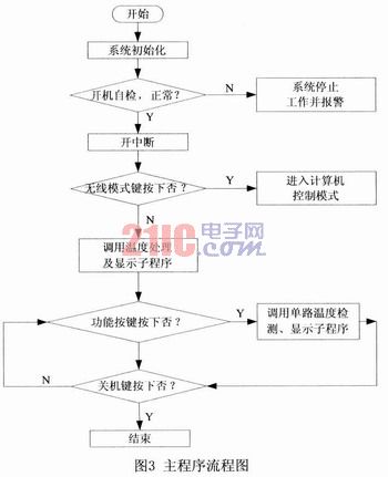 系統(tǒng)上電后單片機(jī)首先進(jìn)行系統(tǒng)初始化,之后程序執(zhí)行相應(yīng)的自檢子程序,檢測測溫系統(tǒng)是否有故障。系統(tǒng)默認(rèn)進(jìn)入的單機(jī)工作模式,在單機(jī)工作模式下,可以根據(jù)功能按鍵選擇不同的功能,通過系統(tǒng)調(diào)用相應(yīng)的功能按鍵處理子程序來完成應(yīng)的功能,并在LED數(shù)碼管上顯示相應(yīng)的溫度信息,具有非常好的人性化特點(diǎn);在無線工作模式下,此時(shí)系統(tǒng)作為一個(gè)下位機(jī),可以和遠(yuǎn)程計(jì)算機(jī)進(jìn)行無線通信,實(shí)現(xiàn)數(shù)據(jù)的遠(yuǎn)距離傳輸,利用計(jì)算機(jī)強(qiáng)大的信息處理功能,把下位機(jī)傳送過來的數(shù)據(jù)進(jìn)行分析和處理。