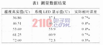 試驗(yàn)數(shù)據(jù)通過對(duì)普通熱水器加熱中的水溫進(jìn)行測量取得,測量中采用實(shí)驗(yàn)用高精密數(shù)字測溫儀的示值溫度作為被測物體溫度檢測點(diǎn)的溫度真實(shí)值,本測溫裝置測得的溫度信息經(jīng)過電路的轉(zhuǎn)換及單片機(jī)的處理后,測得的溫度信息在LED數(shù)碼管上的顯示值如表l所示。從表中的數(shù)據(jù)可以看出,本系統(tǒng)LED顯示值和真實(shí)值很接近;試驗(yàn)過程中,由于測量環(huán)境及其它因素的影響,使得系統(tǒng)的測量值在真實(shí)值上下波動(dòng),但溫度的實(shí)際相對(duì)誤差始終保持在1%以內(nèi),從而證明了本測溫裝置完全能夠滿足實(shí)際的測量要求。