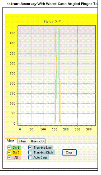 精確度:精確度可定義為,在一個預(yù)先定義的觸摸屏區(qū)域中最大的定位誤差,以手指的實(shí)際位置與測量位置之間的直線距離為單位。在測量精確度時,使用的是一只模擬或機(jī)械手指。手指置于面板上的一個準(zhǔn)確位置,再把手指實(shí)際位置與測量位置進(jìn)行比較。精確度非常重要,使用者希望系統(tǒng)能準(zhǔn)確地找到手指位置。電阻式觸摸屏最令人詬病的一項(xiàng)缺點(diǎn),就是低準(zhǔn)確度,而且準(zhǔn)確度會隨時間逐漸減弱。電容式觸摸屏的精確度創(chuàng)造出許多新應(yīng)用,例如虛擬鍵盤,以及不用觸控筆的手寫辨識。圖1顯示一個結(jié)構(gòu)不完整的觸控面板數(shù)據(jù),顯示手指位置有游移現(xiàn)象,而實(shí)際上模擬手指是進(jìn)行直線移動。