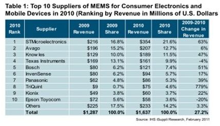 2010年TriQuint在該領(lǐng)域的營業(yè)收入劇增778.6%,達(dá)到7470萬美元,而2009年只有區(qū)區(qū)850萬美元。TriQuint在該市場的排名因而從2009年的第16竄升至第8。意法半導(dǎo)體在10大廠商中的增長率排名第二,其營業(yè)收入大增63.5%,從2009年的2.163億美元上升到3.536億美元,擴(kuò)大了在全球消費(fèi)與移動(dòng)MEMS銷售額方面的領(lǐng)先優(yōu)勢(shì)。