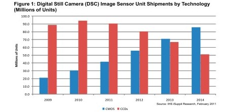 據(jù)IHS iSuppli公司的研究,數(shù)碼相機(jī)CMOS圖像傳感器出貨量未來三年將快速增長,到2013年將首次超過CCD。